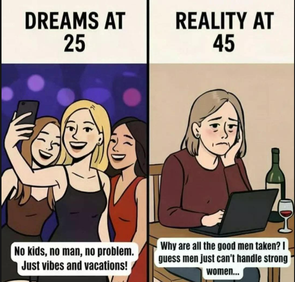 Doesn’t apply to lesbians or 45 year old women who still don’t want to get married or don’t regret the choices they were free to make.