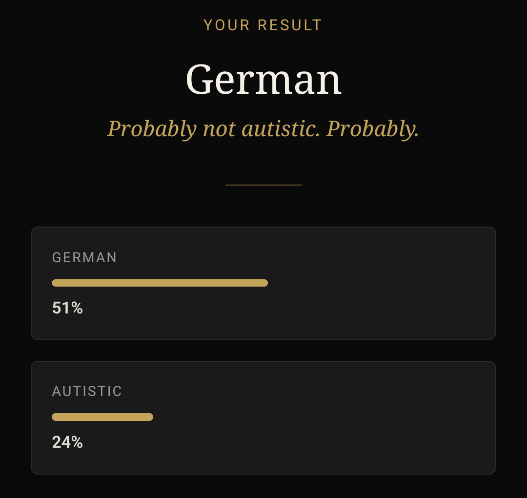 As a French, I am 46% German, yet 30% autistic. Time for a croissant.