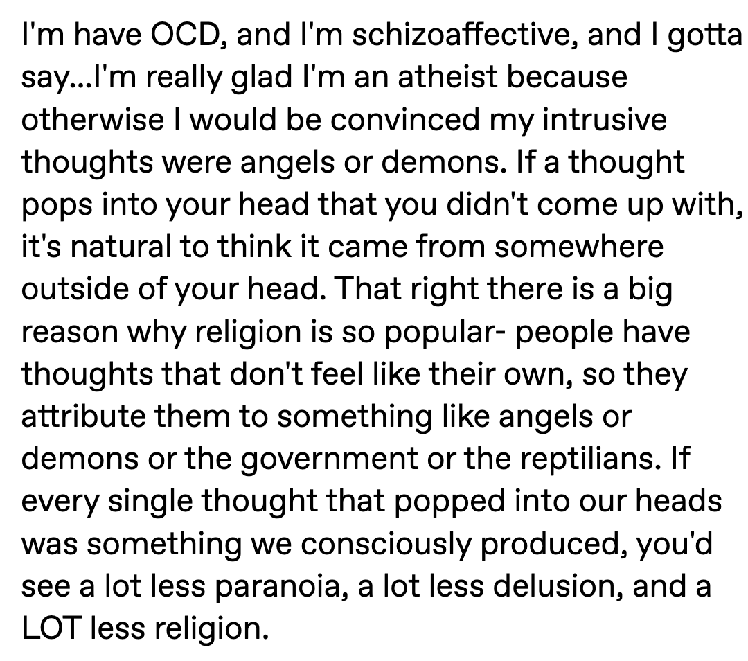 My first gut feeling is usually delusional. I've dealt with delusional thinking for pretty much my whole life. I've been able to deal with because I know that it's not an evil demon or the voice of the Satan, no....it's just my brain misfiring, nothing more, it's not part of what defines me as a person. So the scientifically accurate way of looking at it is by far the healthier way because it doesn't put the blame on you. It doesn't make you convinced that you're being punished because you're a sinner.